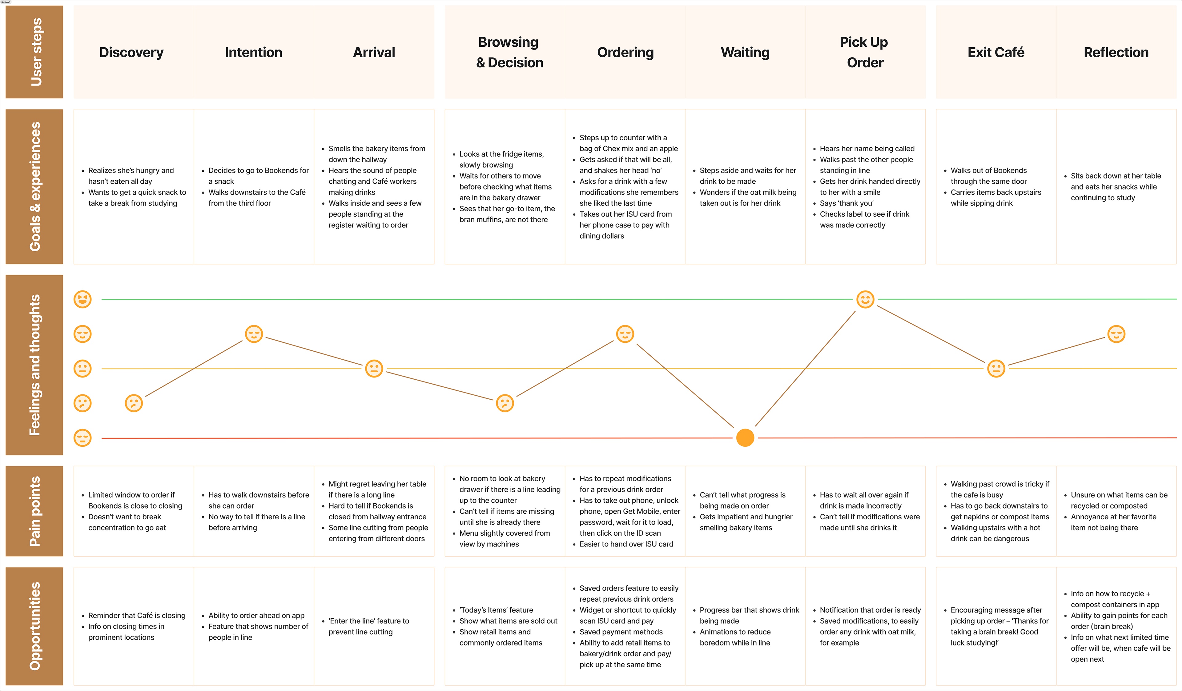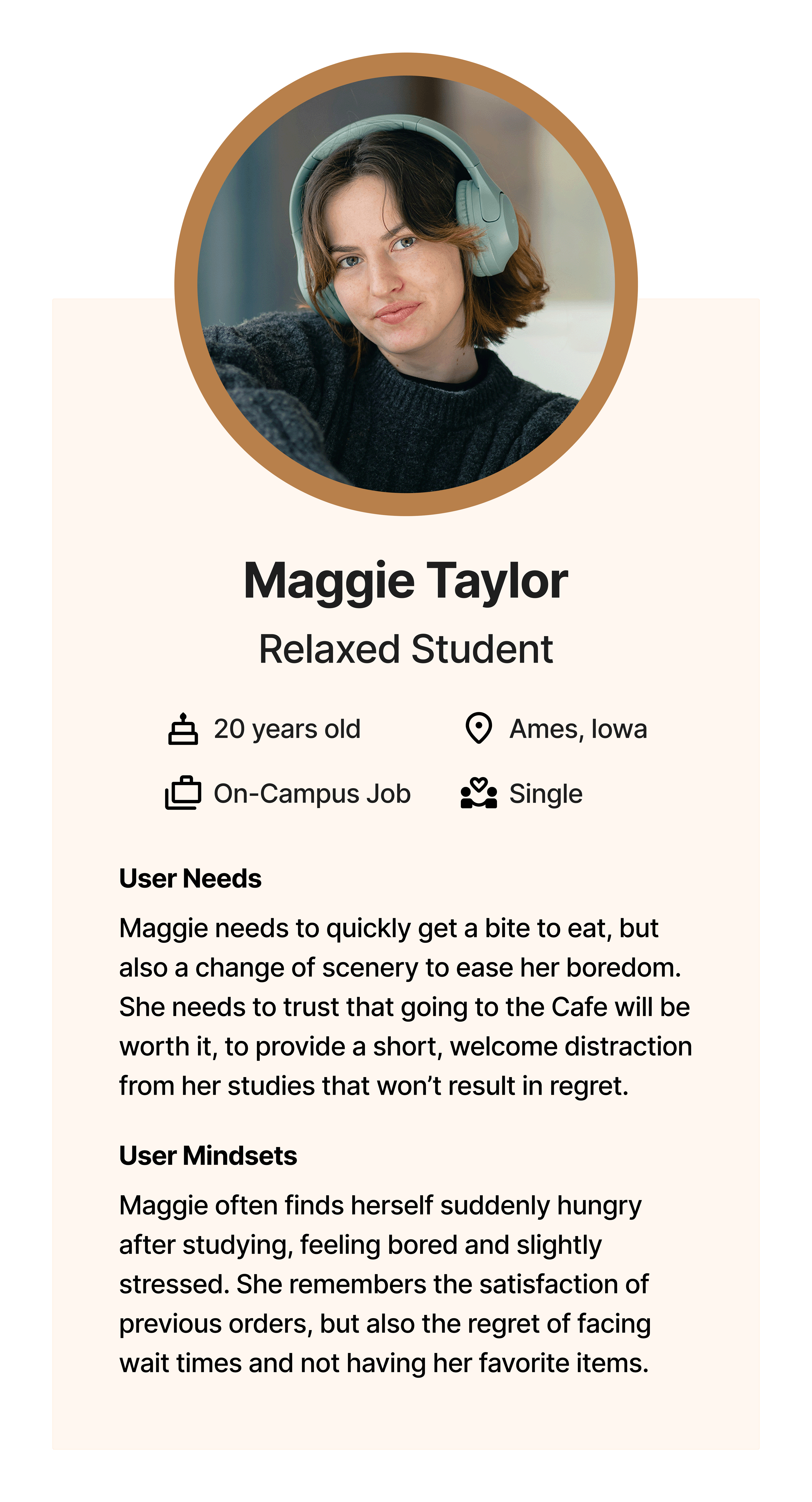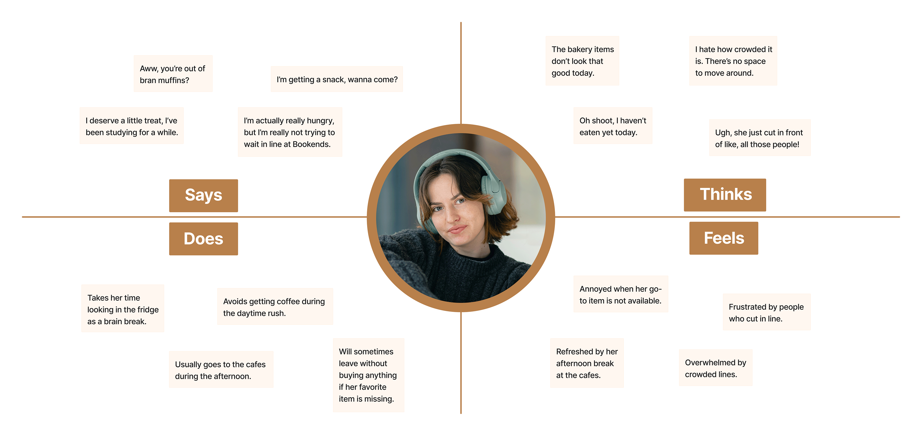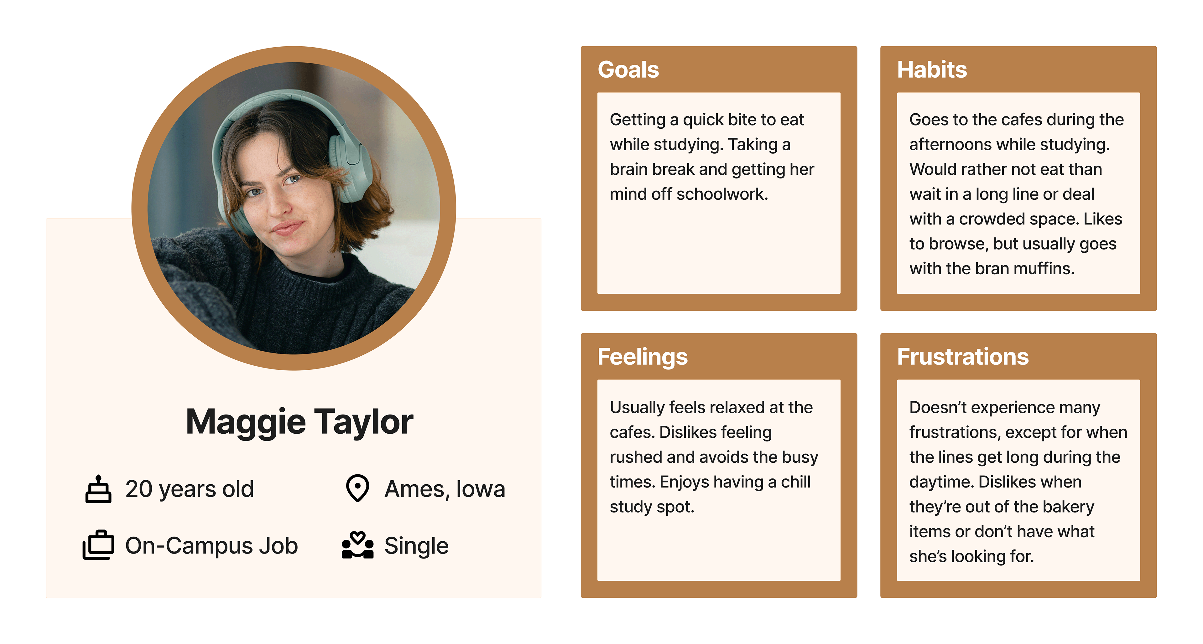 I began the project by interviewing café-goers in campus cafes. In a series of short conversations, I asked members of my target user profile several questions related to their café habits, including: